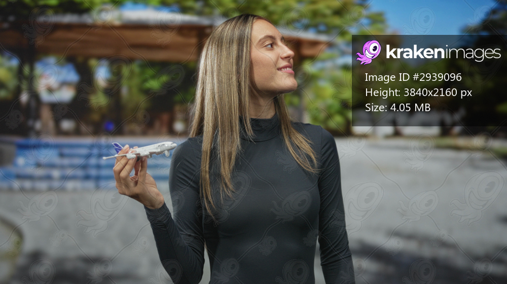 Woman holding a white model airplane with extended wings and smiling in a studio with a blurred park backdrop; travel aspiration wanderlust.