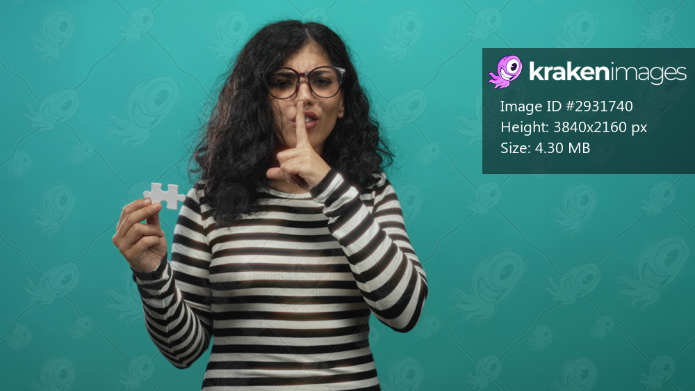 Woman holding a white puzzle piece and pressing index finger to lips in a turquoise studio while wearing striped top and glasses; silence secrecy.