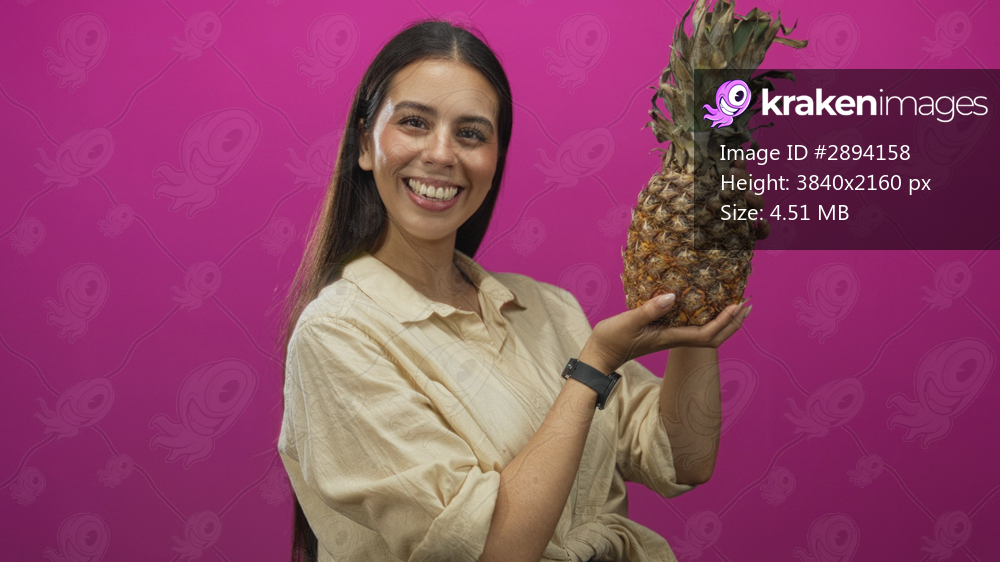 Woman holding a whole pineapple with both hands in a studio set against a bright magenta wall, smiling at camera with relaxed posture; happiness.