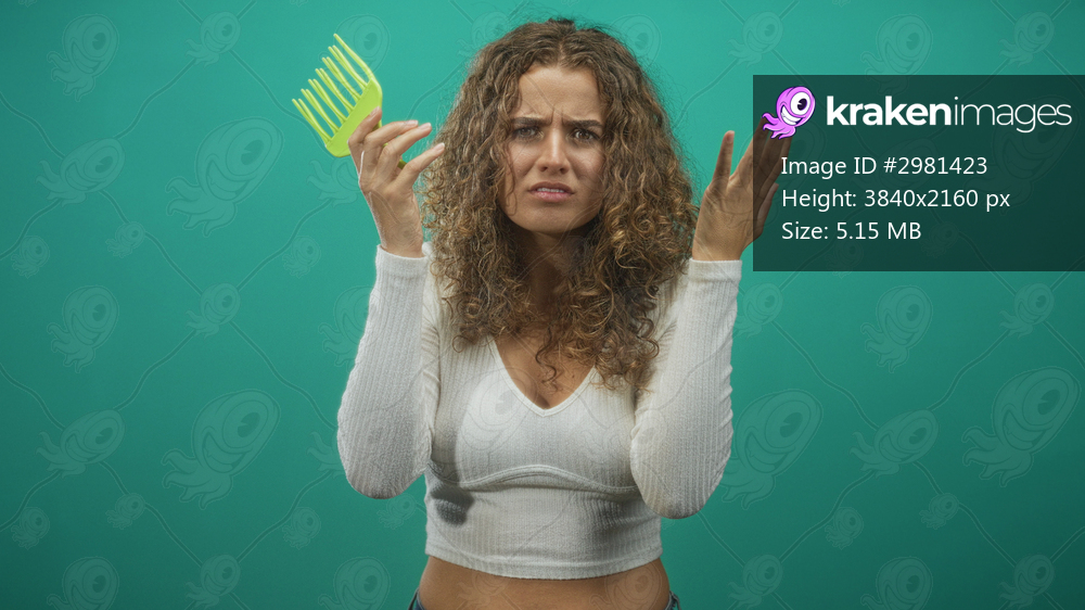Woman holding a wide tooth comb and clutching her curly hair while grimacing in studio; frustration hair care.