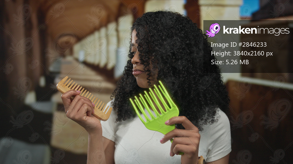 Woman holding a wooden comb and a green comb while comparing hair tools on a cobblestone street; indecision choice.