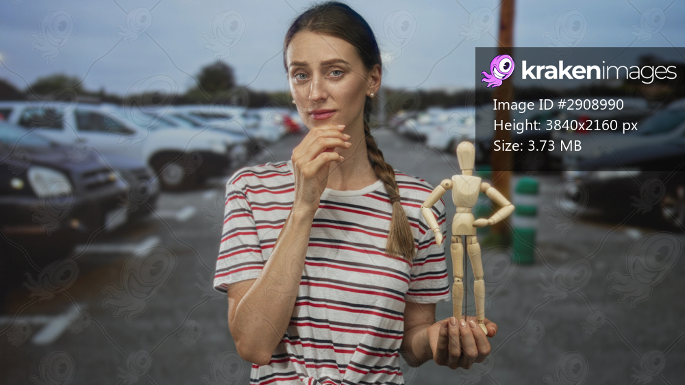 Woman holding a wooden mannequin in a parking lot with hand to mouth gesture, pensive expression; worry doubt.