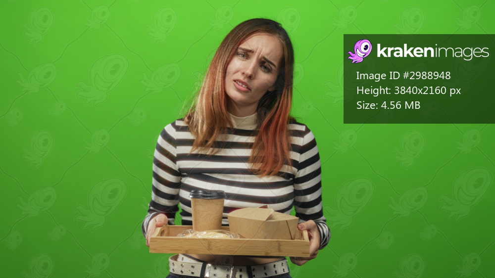 Woman holding a wooden tray with coffee cup, takeout boxes and pastry with both hands in studio wearing striped shirt and belt; frustration.
