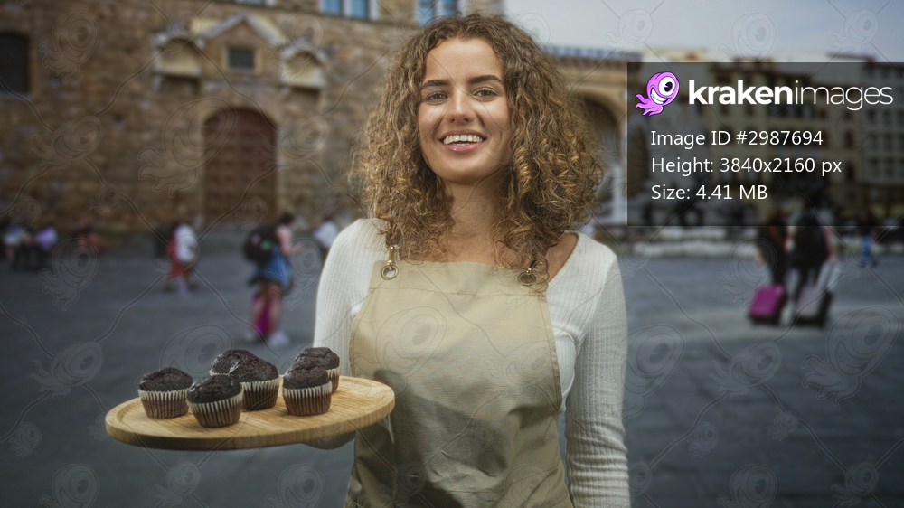 Woman holding a wooden tray of chocolate muffins, smiling and presenting them with her right hand on a cobbled street near historic buildings; joy hospitality. - Kraken Images