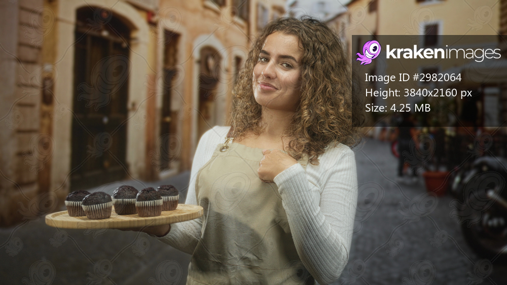 Woman holding a wooden tray of chocolate muffins, touching apron strap at chest while smiling on a cobblestone street; friendly hospitality.