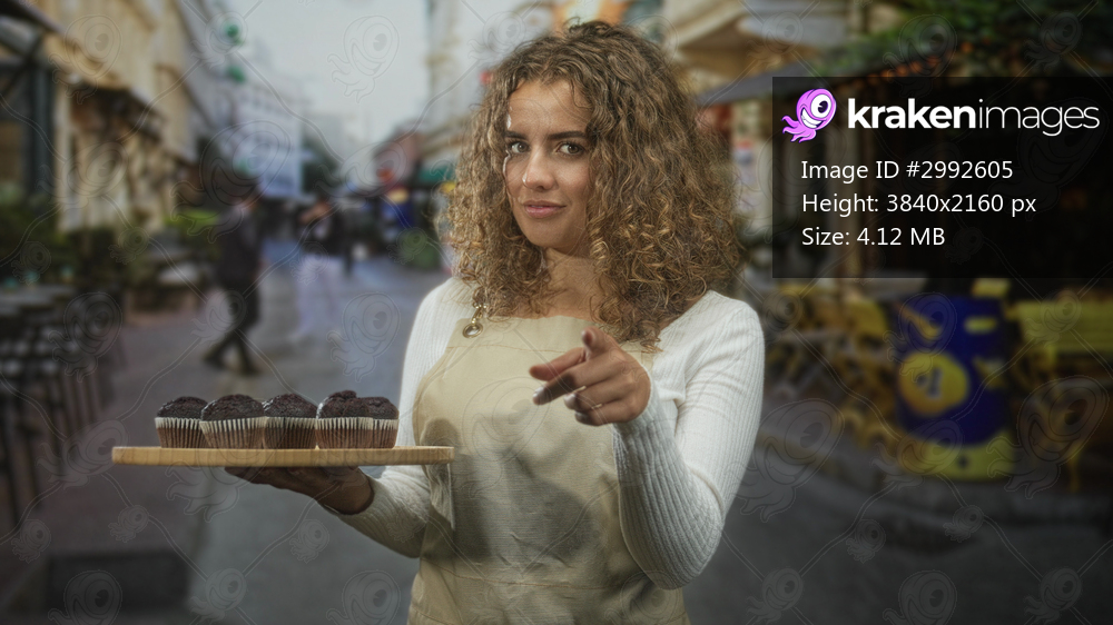 Woman holding a wooden tray of chocolate muffins wearing beige apron on a busy street cafe; hospitality invitation.