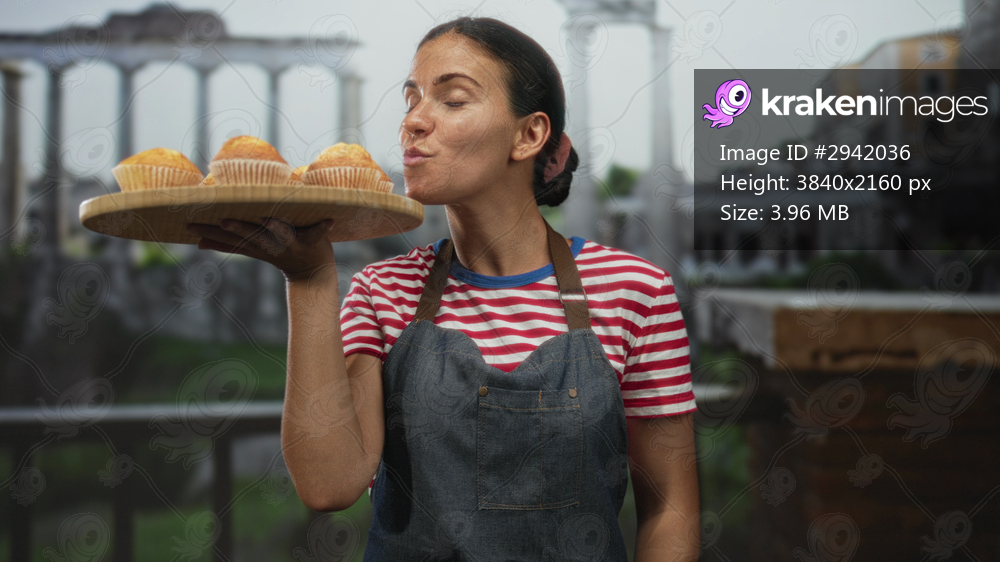 Woman holding a wooden tray of muffins at roman ruins building while wearing an apron and striped shirt; artisan baking pride.