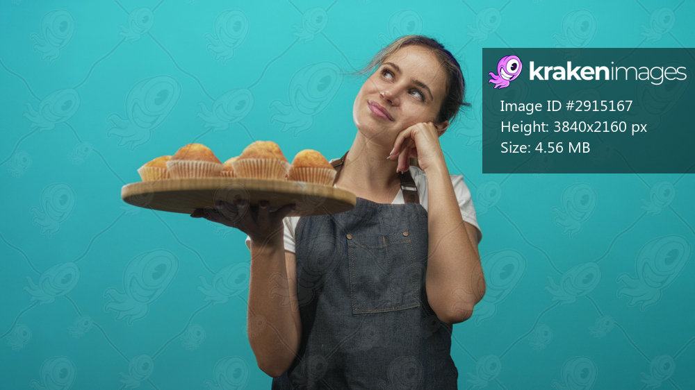 Woman holding a wooden tray of muffins, wearing denim apron and touching hair in teal studio; baking pride.