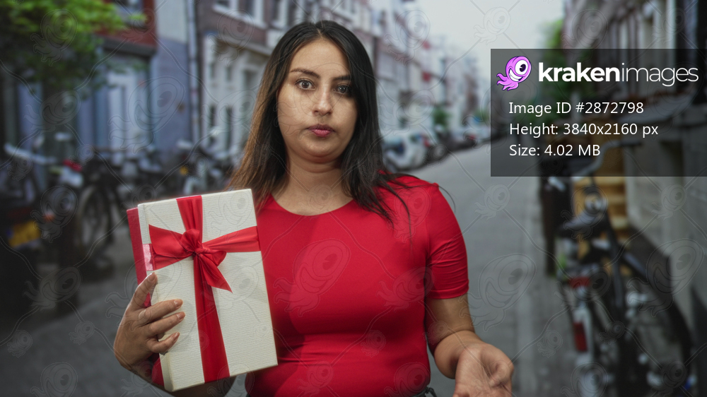 Woman holding a wrapped gift box and gesturing with her hand on a city street; hesitation uncertainty.