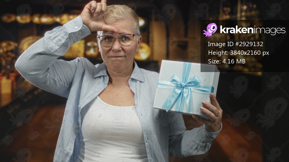 Woman holding a wrapped gift box and making an l sign on her forehead in a building; playful lighthearted humor.