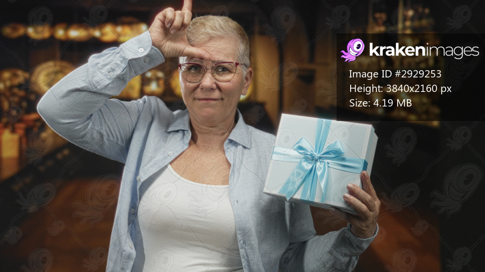 Woman holding a wrapped gift box and making an l sign on her forehead in a building; playful lighthearted humor.