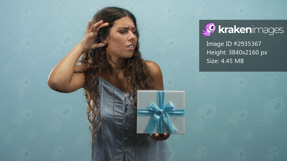 Woman holding a wrapped present with blue ribbon while cupping her ear with hand in studio setting, glancing toward the box in mild discomfort; curiosity reaction. - Kraken Images