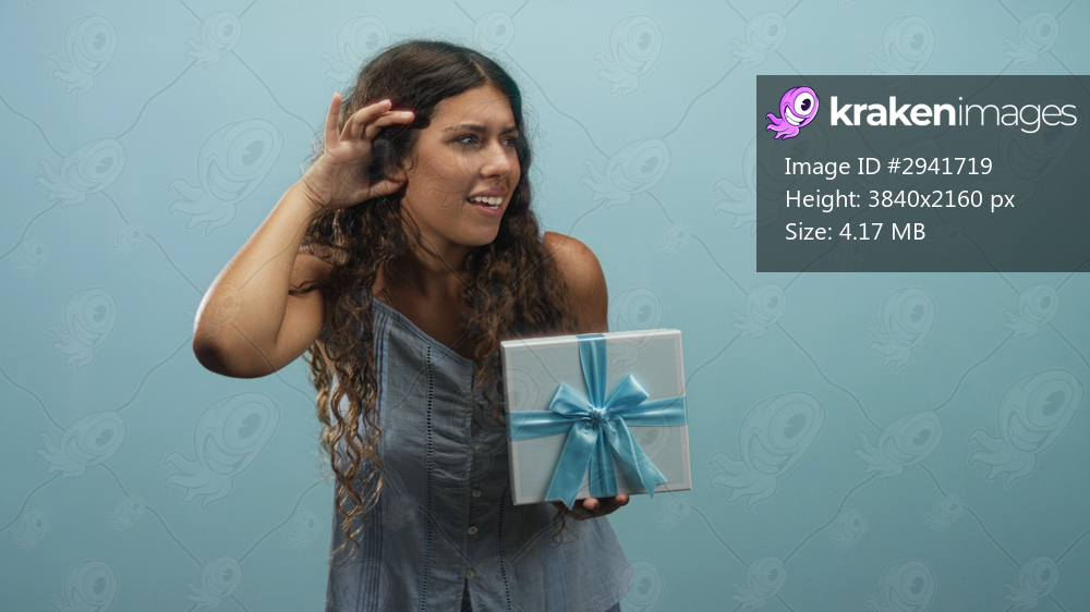 Woman holding a wrapped present with blue ribbon while cupping her ear with hand in studio setting, glancing toward the box in mild discomfort; curiosity reaction. - Kraken Images