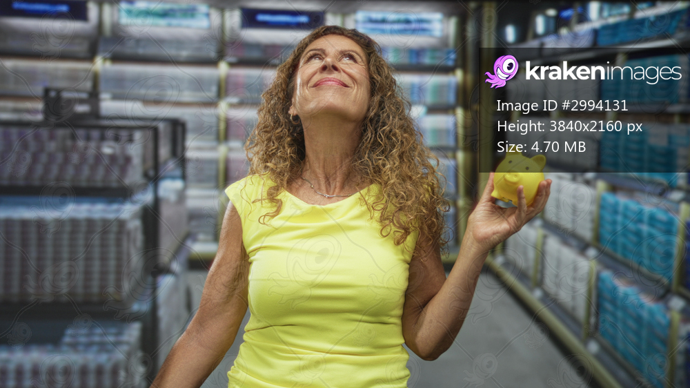 Woman holding a yellow piggy bank at shoulder height, looking up and smiling in a retail building aisle; hopeful savings future.