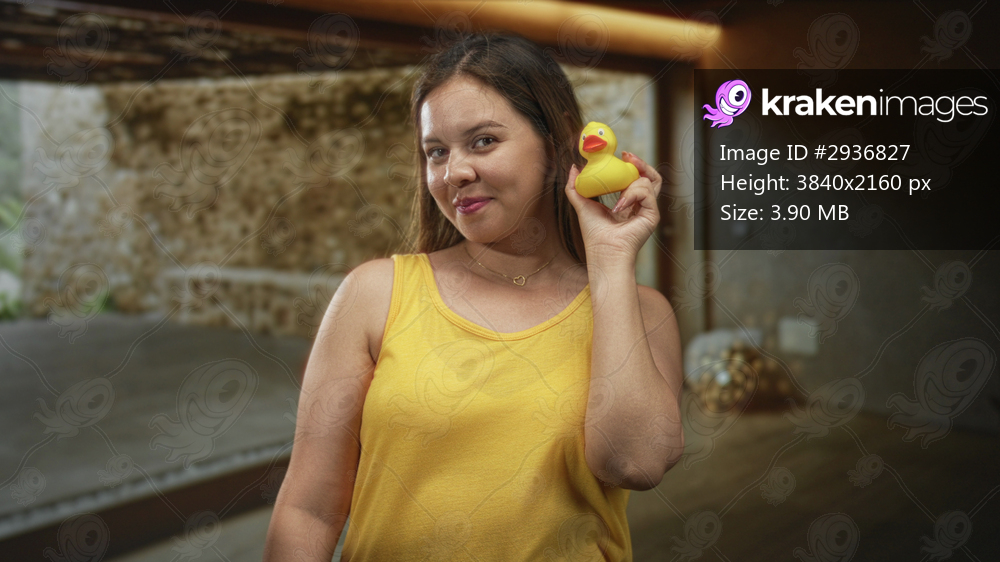 Woman holding a yellow rubber duck in studio room, smiling while looking at the duck; playful curiosity.