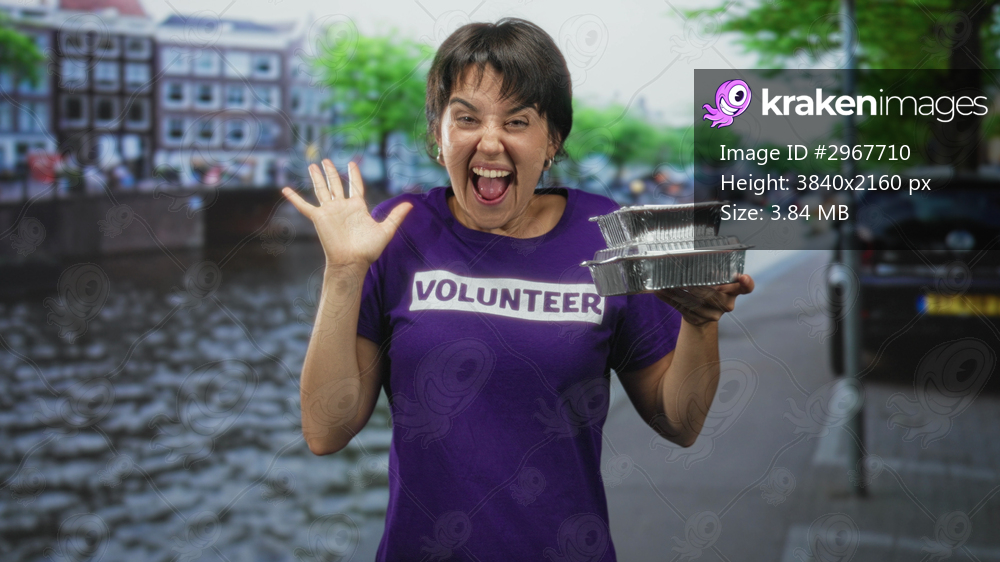 Woman holding aluminum food trays and waving hand on street, smiling broadly with volunteer shirt; joyful generosity.