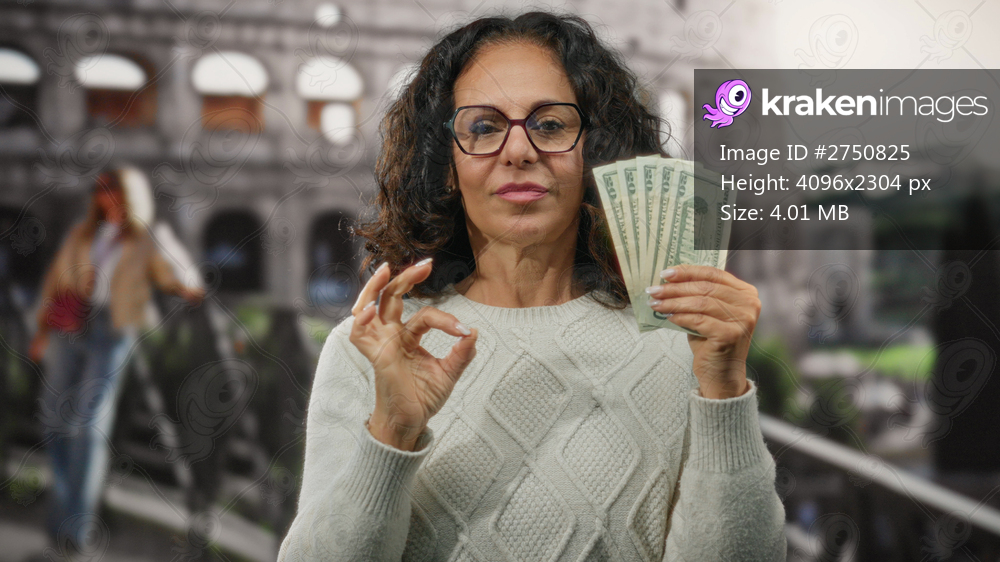 Woman holding american dollars near the roman coliseum makes an ok gesture, combining elements of travel and finance in an iconic italian outdoor city setting. - Kraken Images