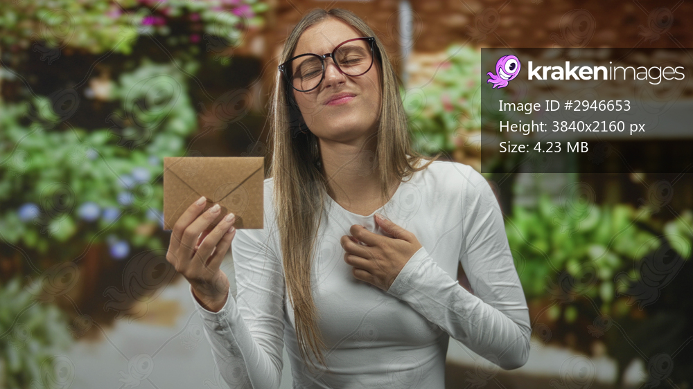 Woman holding an envelope with hand on chest and eyes closed on a street courtyard with potted plants and brick wall; longing.