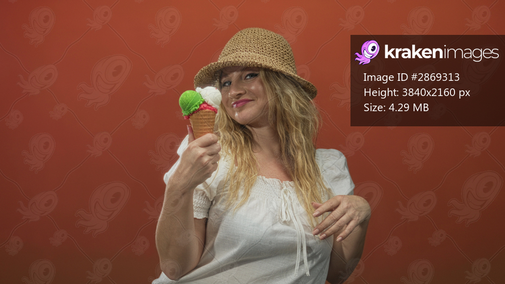 Woman holding an ice cream cone and puckering lips while wearing a straw hat and white blouse in a studio orange set; delight.