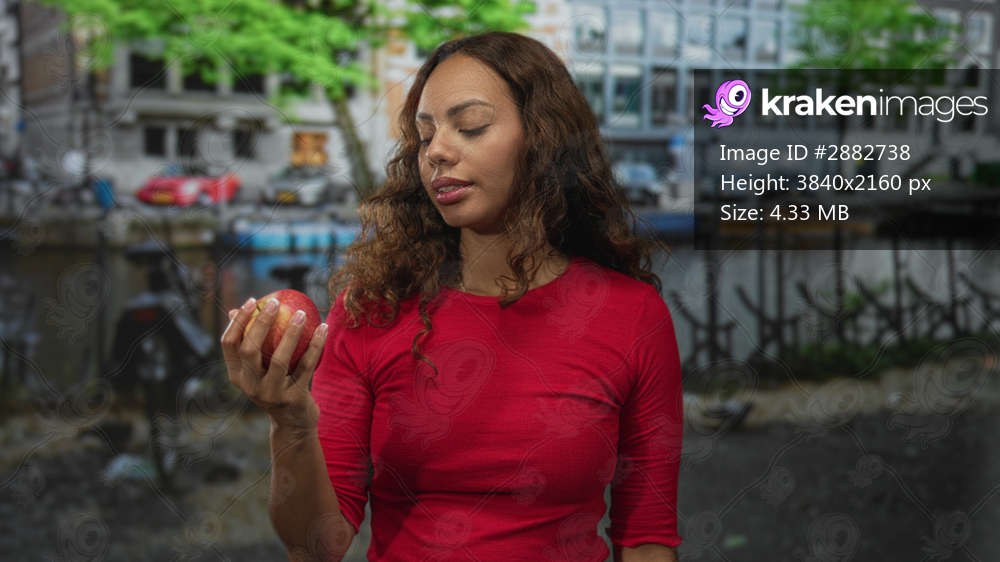 Woman holding apple with finger on chin on street by canal and building in amsterdam; thoughtful pondering.