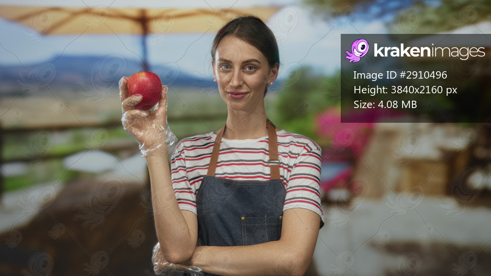 Woman holding apple in gloved hand on a terrace building outside restaurant wearing apron and striped shirt, arm folded; confidence.