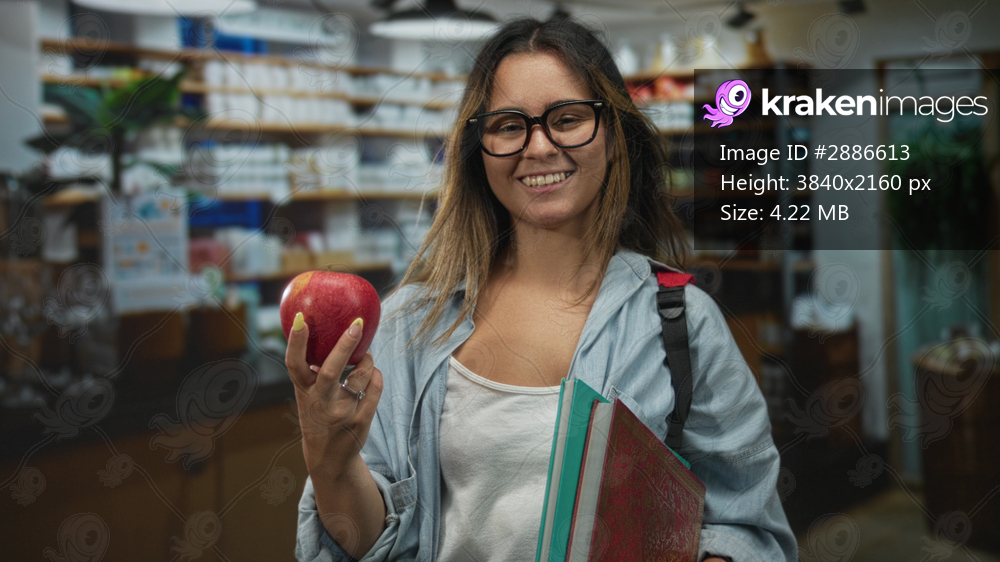 Woman holding apple and notebooks wearing glasses while smiling in a pharmacy building; healthy choice confidence.