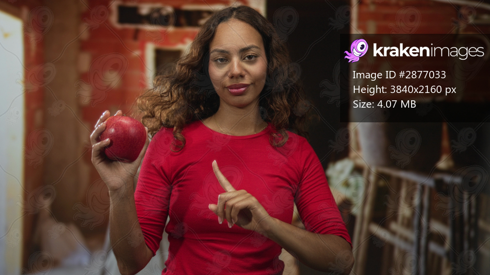 Woman holding apple and points finger in building interior, hand visible gripping fruit while indicating forward gesture; healthy choice confidence.