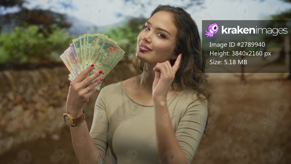 Woman holding argentinian pesos in a green park, smiling confidently outdoors, surrounded by lush nature, emphasizing wealth and leisure in an open environment. - Kraken Images