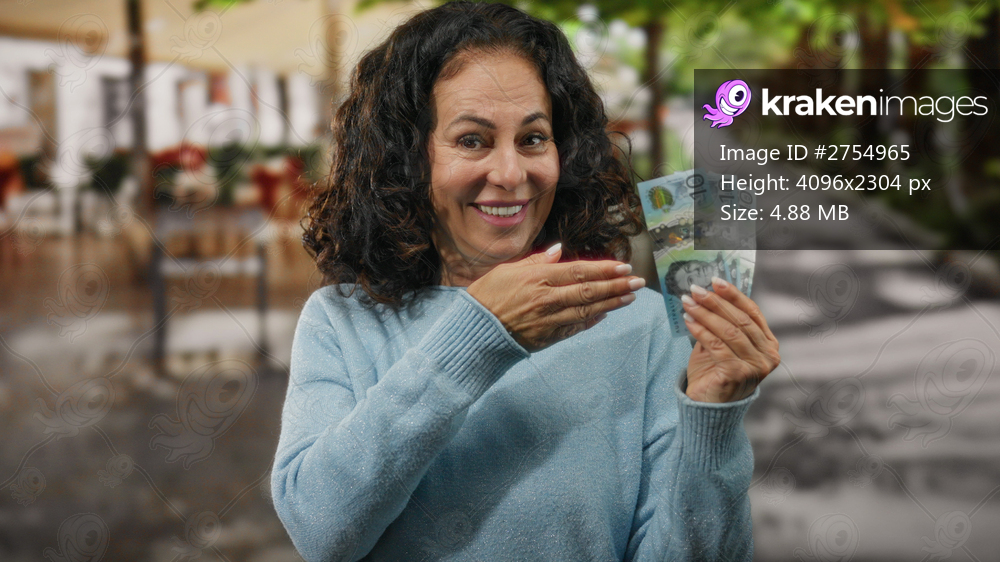 Woman holding australian dollars in a city street, smiling and giving a thumbs-up, conveying positivity and financial success, middle-aged in casual attire during a sunny day. - Kraken Images
