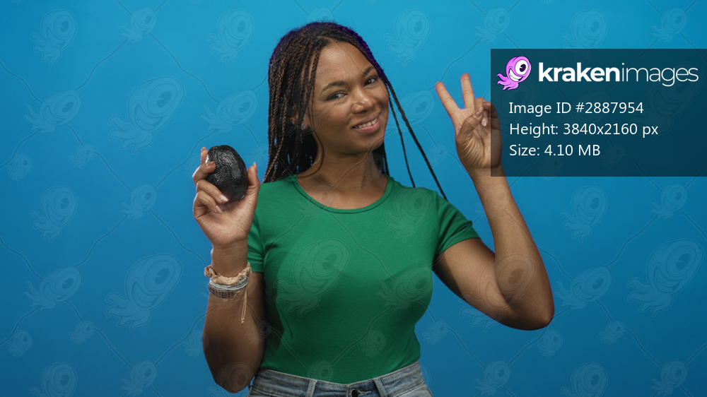 Woman holding avocado and flashing peace sign in studio with blue backdrop; healthy snack playful energy.