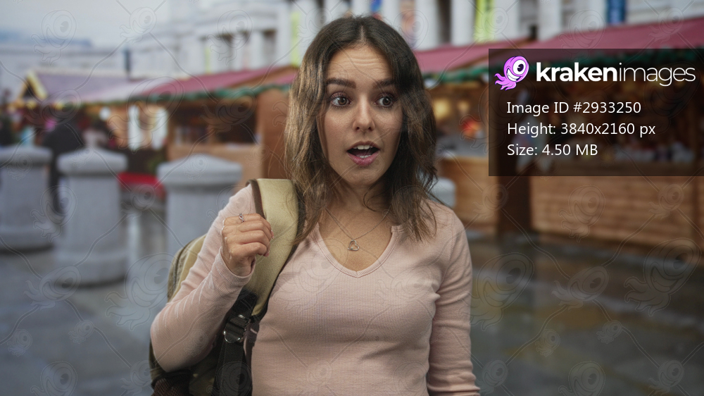 Woman holding backpack strap with hand near chest on street market stalls; surprise curiosity travel.