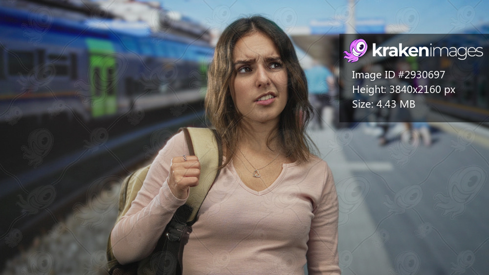 Woman holding backpack strap on train platform street with train nearby and puzzled expression; travel frustration.