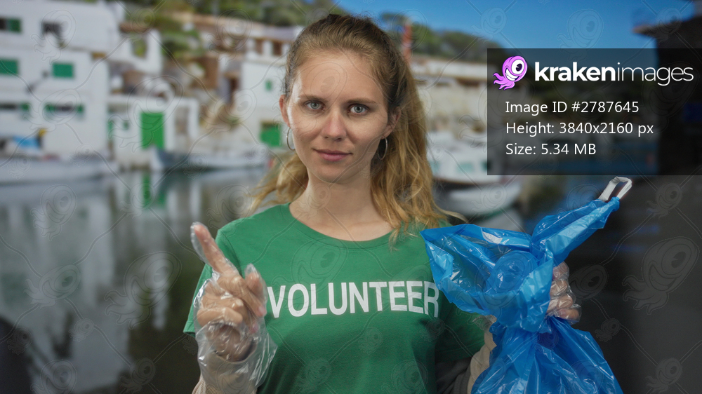 Woman holding bag shows peace sign at harbor with blonde volunteer wearing gloves cleaning environment during cleanup near blue water.