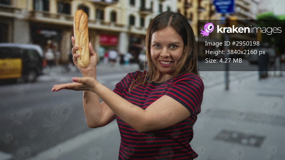 Woman holding baguette and giving thumbs up on street presenting bread with a smiling pose; friendly approval.