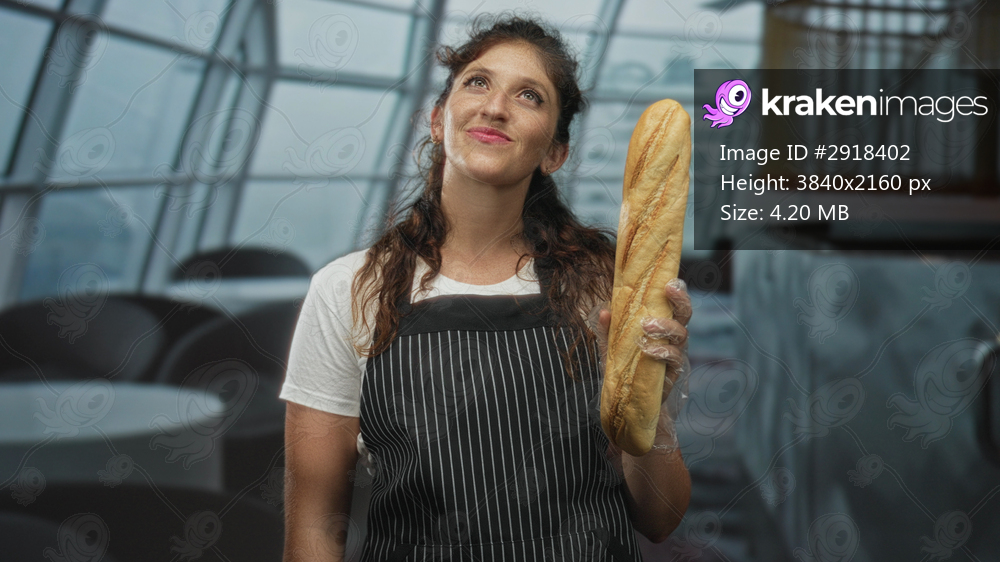 Woman holding baguette with gloved hand inside building restaurant dining area, wearing striped apron; warmth hospitality.