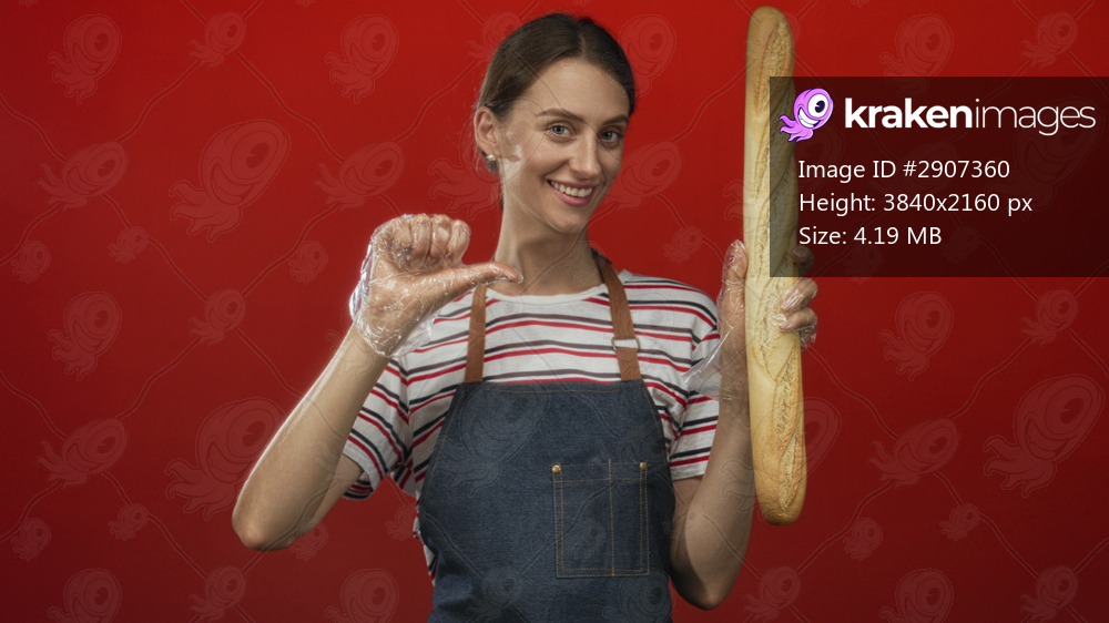 Woman holding baguette in red studio, thumb pointing to chest while wearing plastic gloves; friendly hospitality.