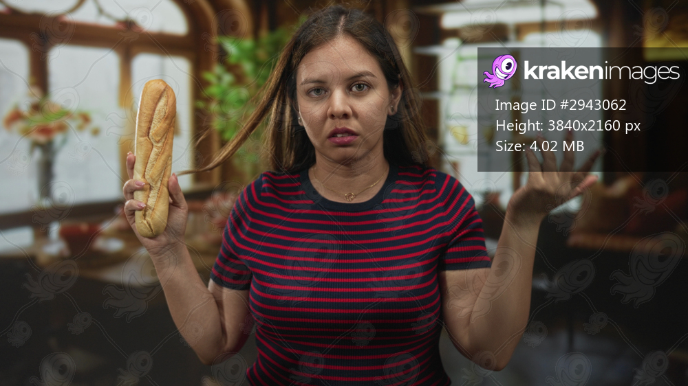 Woman holding baguette with middle finger raised in building, wearing striped shirt and pursed lips; defiance.