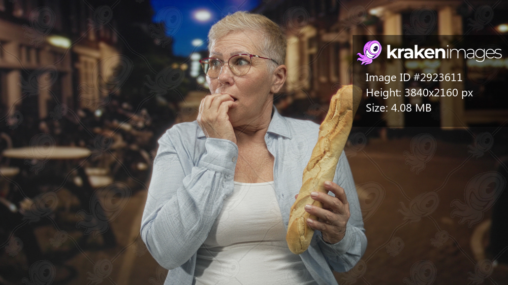 Woman holding baguette on a night street with hand to chin and furrowed brow, wearing glasses and open shirt; urban anxiety hunger.