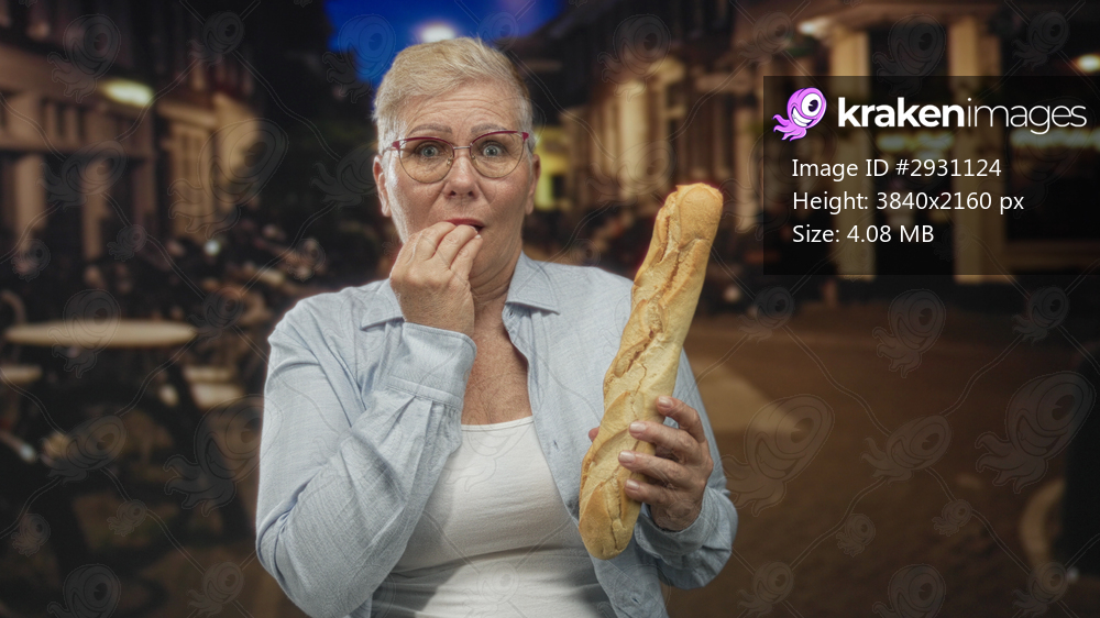 Woman holding baguette on a night street with hand to chin and furrowed brow, wearing glasses and open shirt; urban anxiety hunger.