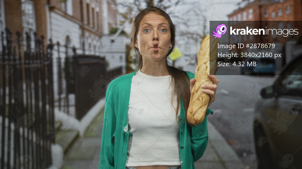 Woman holding baguette on street making fish face with hand raised, wearing green cardigan and white top; playful.