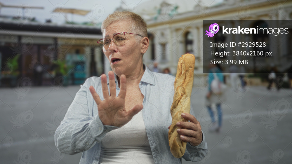 Woman holding baguette with palm out to stop in street by a building, eyes narrowed and lips pressed, rejecting the bread; disgust refusal.