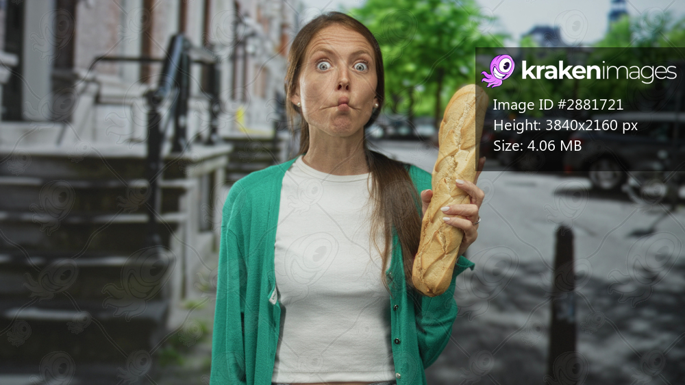 Woman holding baguette and pursing lips on a sunny city street with parked cars and stone steps visible; playful curiosity.