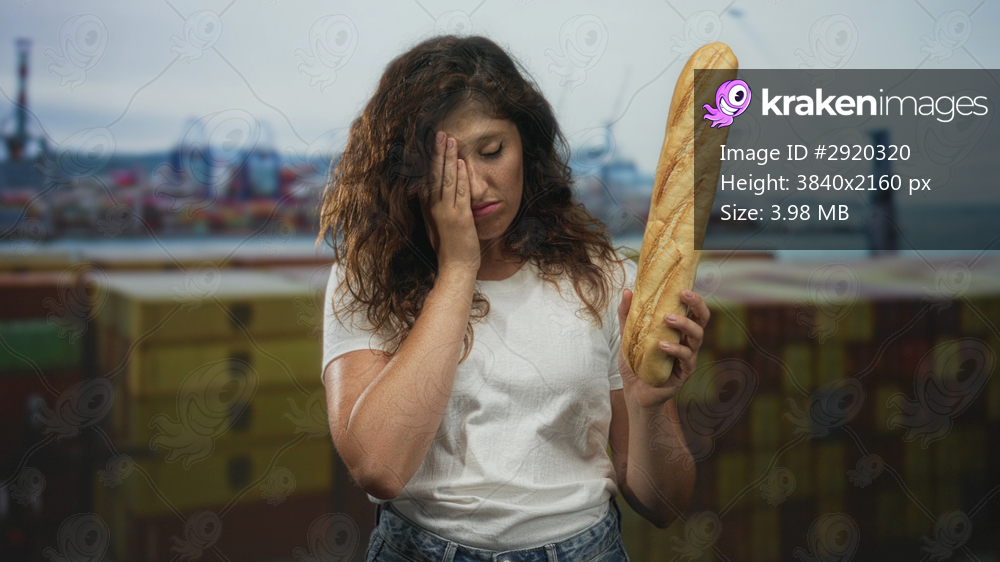 Woman holding baguette touches cheek with hand at port shipping containers and cranes visible; tired toothache.