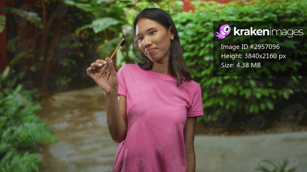 Woman holding bamboo toothbrush between fingers, presenting hand gesture in forest setting; eco friendly calm.
