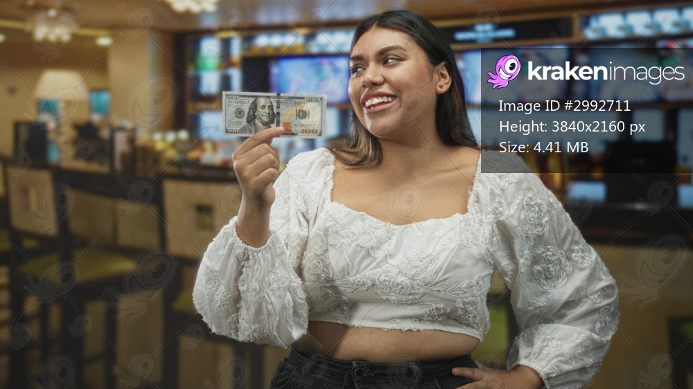 Woman holding banknote between fingers revealing bare midriff while smiling and presenting money at a bar counter in building; confidence prosperity success empowerment. - Kraken Images
