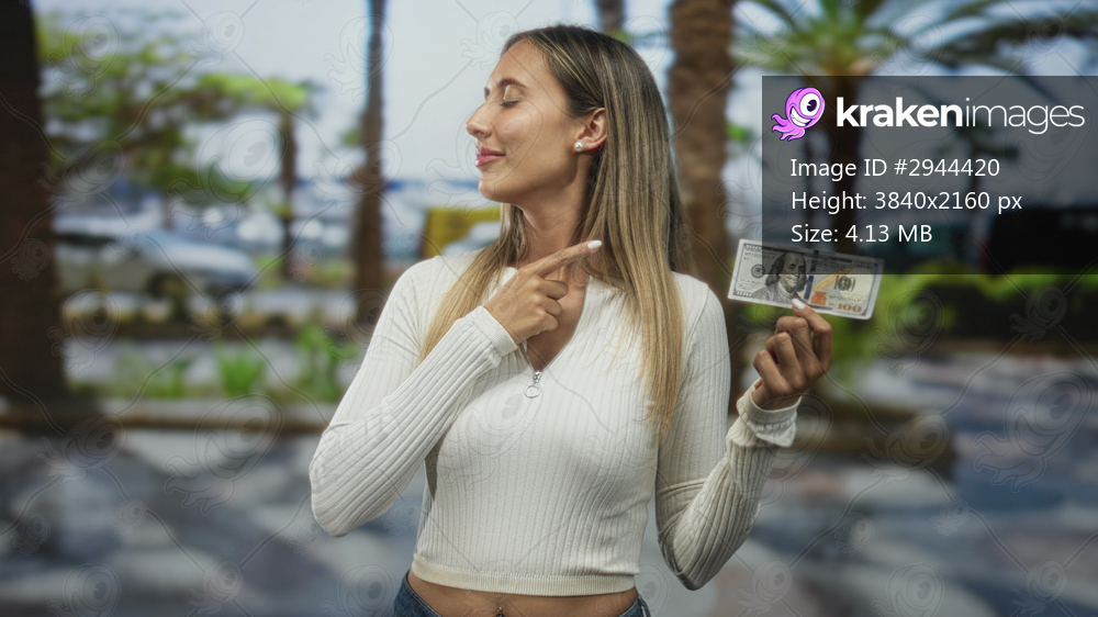 Woman holding banknote with closed eyes points finger to chest on street; confidence wealth success ambition.