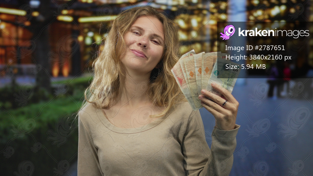 Woman holding banknotes while smiling on street highlights blonde young charm as money cash fanning evokes urban vitality.