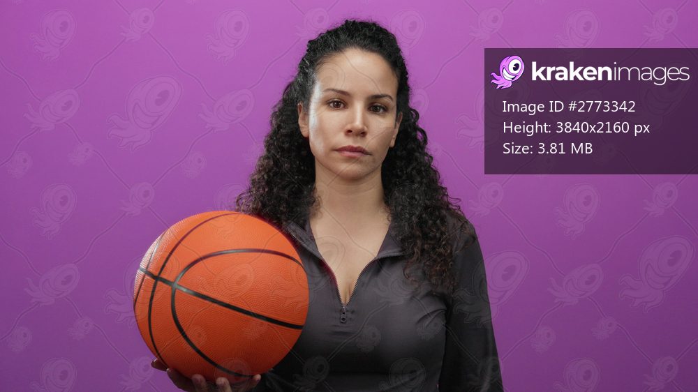 Woman holding basketball against a vivid purple background, highlighting confidence and focus in a sports portrait