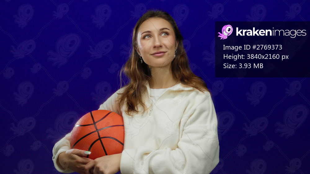 Woman holding basketball against blue background, wearing white sweater, expressing confidence and youth, highlighting sports and style in a studio setting. - Kraken Images