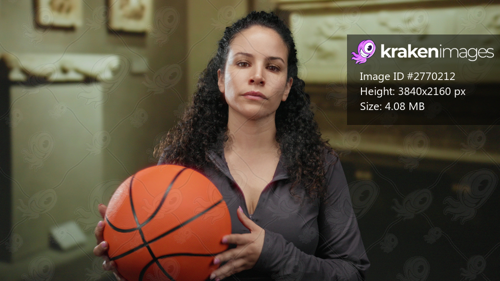 Woman holding basketball in indoor museum setting, showcasing youthful hispanic presence amidst artistic exhibits.